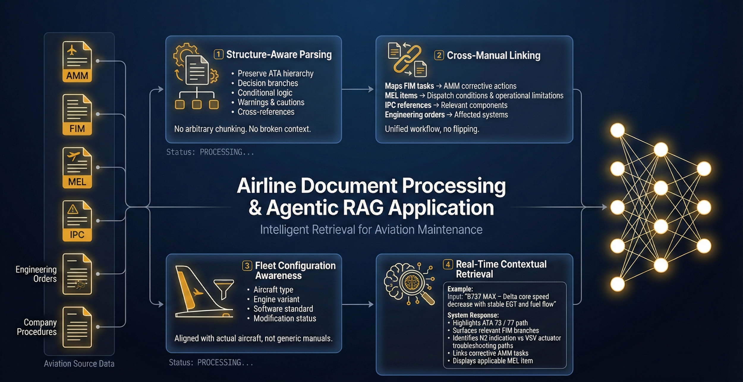 Manuals are processed to preserve ATA hierarchy, decision branches, conditional logic, warnings, and cross-references.